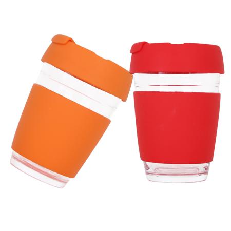 Flip Top glass coffee cups are the perfect reusable coffee cups. Both the silicone and the glass are made from food-grade material. The heat resistant silicone band ensures they are easy to hold with any hot beverages and you can mix and match the colours of the lid and the grips. A great way to promote your eco-friendly credentials, these compact reusable glass cups are perfect for your morning coffee cuppa. We have 8 different standard colours of bands and lids in stock, and also the PMS matching is available.