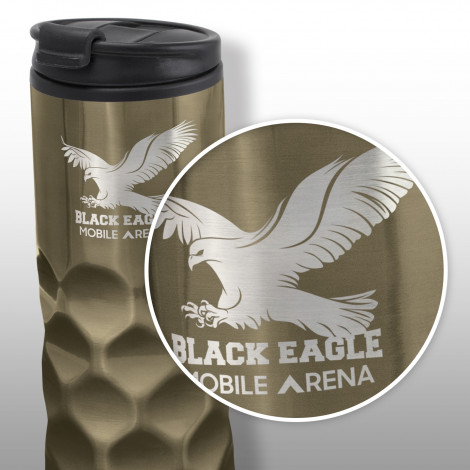 Tall 400ml BPA-free double wall coffee cup which will keep drinks hot for longer. It is features a patterned stainless steel outer wall and a polypropylene inner wall. Corvette has a secure screw on lid with a splashproof flip closure and a soft non-marking base. The gunmetal colour laser engraves to a shiny steel finish and the stainless steel colour engraves to a natural etch. This product is not dishwasher safe and handwashing is recommended.