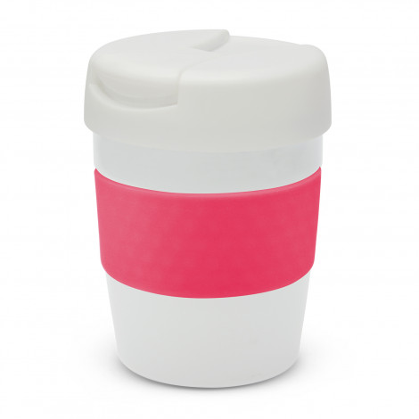 Premium 230ml double wall, vacuum insulated stainless steel cup which will keep drinks hot for up to three hours. It has a soft-touch silicone band and a secure screw on lid with a splashproof flip closure. The cup, lid and band can be mixed and matched in any colour combination from the standard colours at no extra cost. Up to five different colour combinations are included in the price and more are available for an additional charge. Java is BPA-free and is presented in a black gift box. An optional gift tube is available on request. This product is not dishwasher safe and handwashing is recommended.