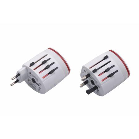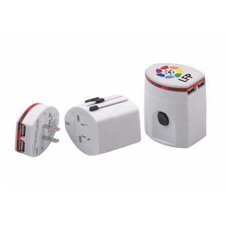 The Light-up Universal Travel Adapter with USB makes charging your devices easy when traveling! This item is compatible with US, UK, and EU outlets, and lights up while being used! Charge up to 2 devices at the same time, and easily switch from 110 to 220 volts.