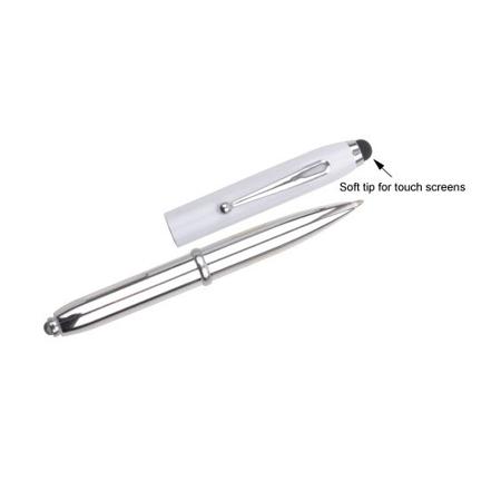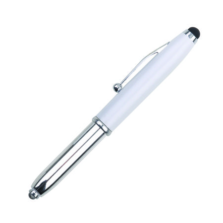 The Multi-Function Light Up Pen is definitely a must-have for people who love multipurpose products! This item is a pen, a stylus, and a LED lightball flashlight combined, all sleekly enclosed in a chrome-plated pen body with a colored cap. Available in 4 colors: black, white, red, and blue.