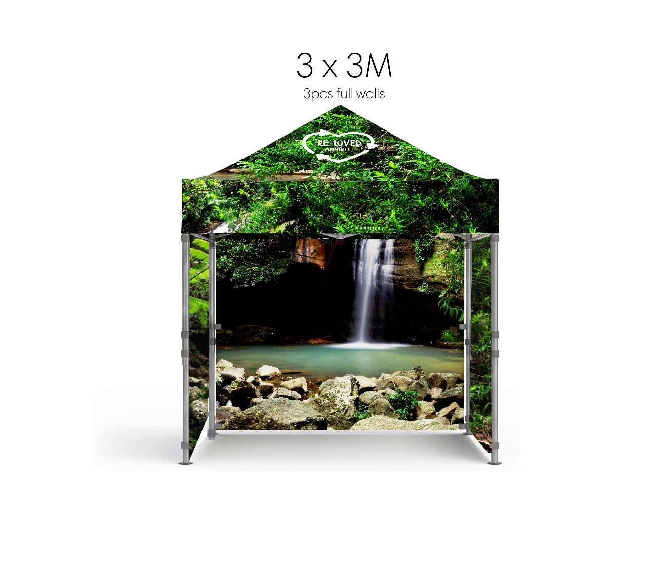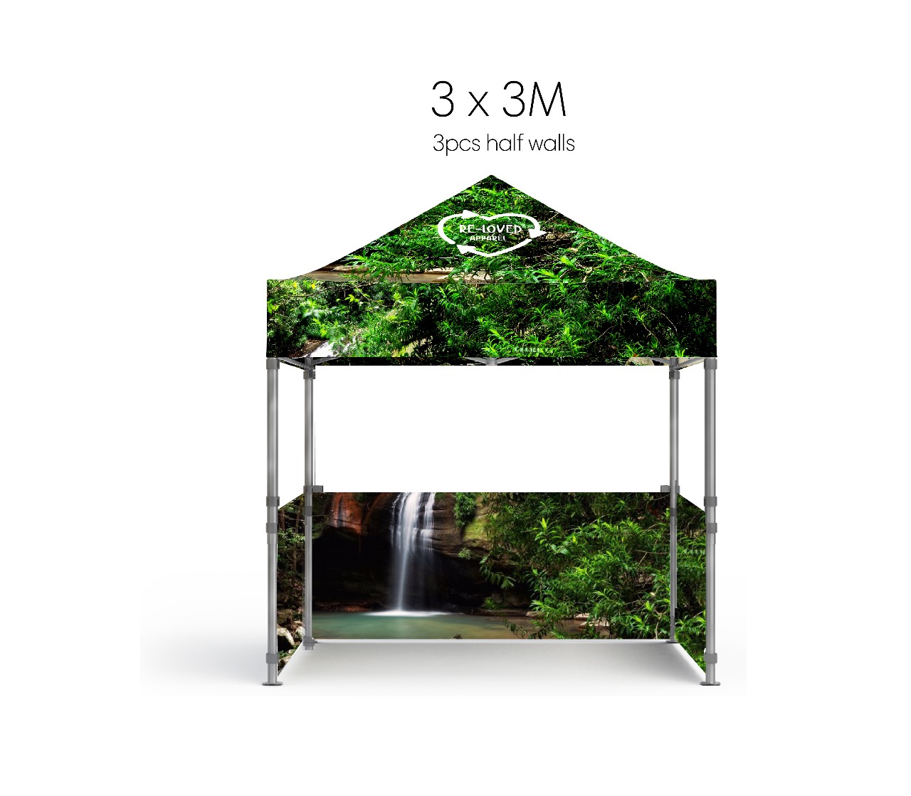 Our waterproof and flame retardant heavy duty 600D sustainable rPET canopy will maximise your brand exposure and keep you shaded and dry. We can also print back and side walls for an additional cost.