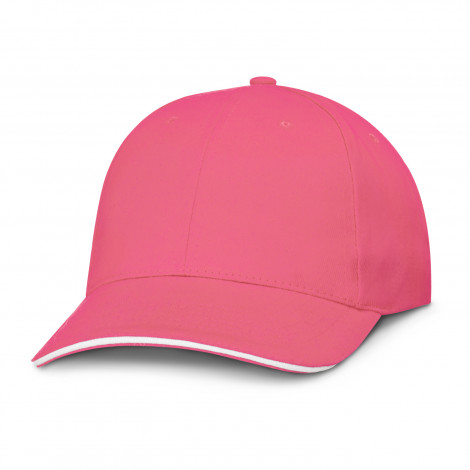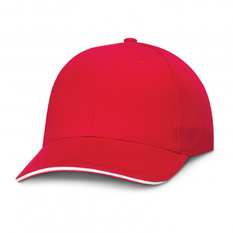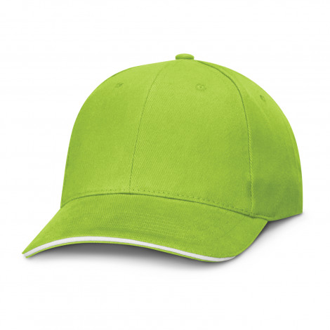 Structured six panel, heavy brushed cotton cap with white trim in the pre-curved sandwich peak. Has embroidered eyelets, a sweat band and an adjustable closure complete with a metal buckle which allows one size to fit most people.
